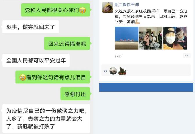 陳思宇是一名職工醫(yī)院的護(hù)士,團(tuán)支部書記,同時(shí)也是共產(chǎn)黨員,業(yè)務(wù)能力強(qiáng),責(zé)任心強(qiáng),接到通知后,她表示堅(jiān)決服從組織安排?!?span id="ncajfquxxkiu" class="highlight">唯一有些顧慮的就是孩子還小,從來沒有離開過媽媽。但是家里孩子的奶奶爺爺、姥姥姥爺非常支持,覺得這是一件非常有意義的事兒,他們一定會好好照顧孩子,全家人的支持把我的顧慮都解決了。然后我就特別灑脫的坐上了去石家莊支援的車?!标愃加钚χf。